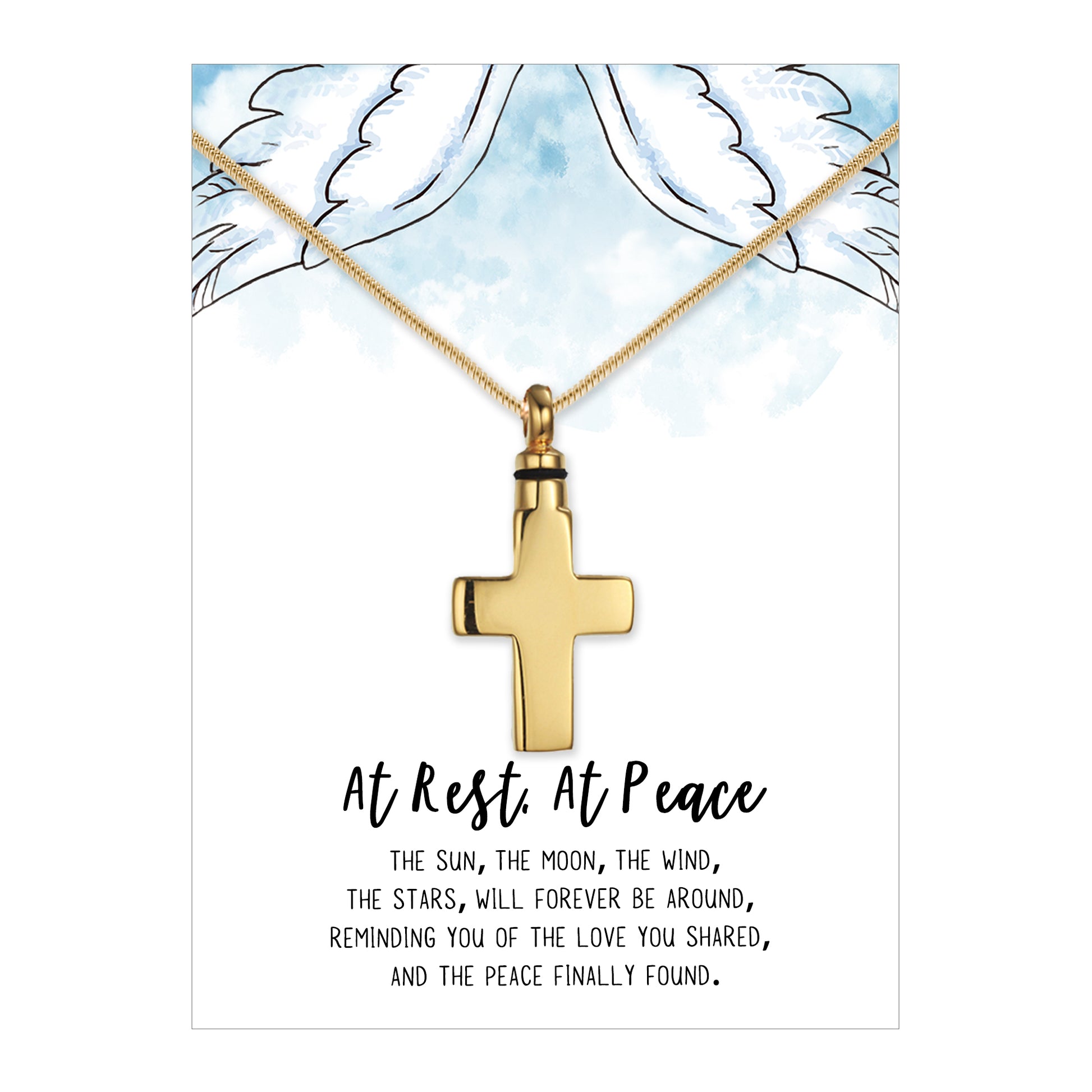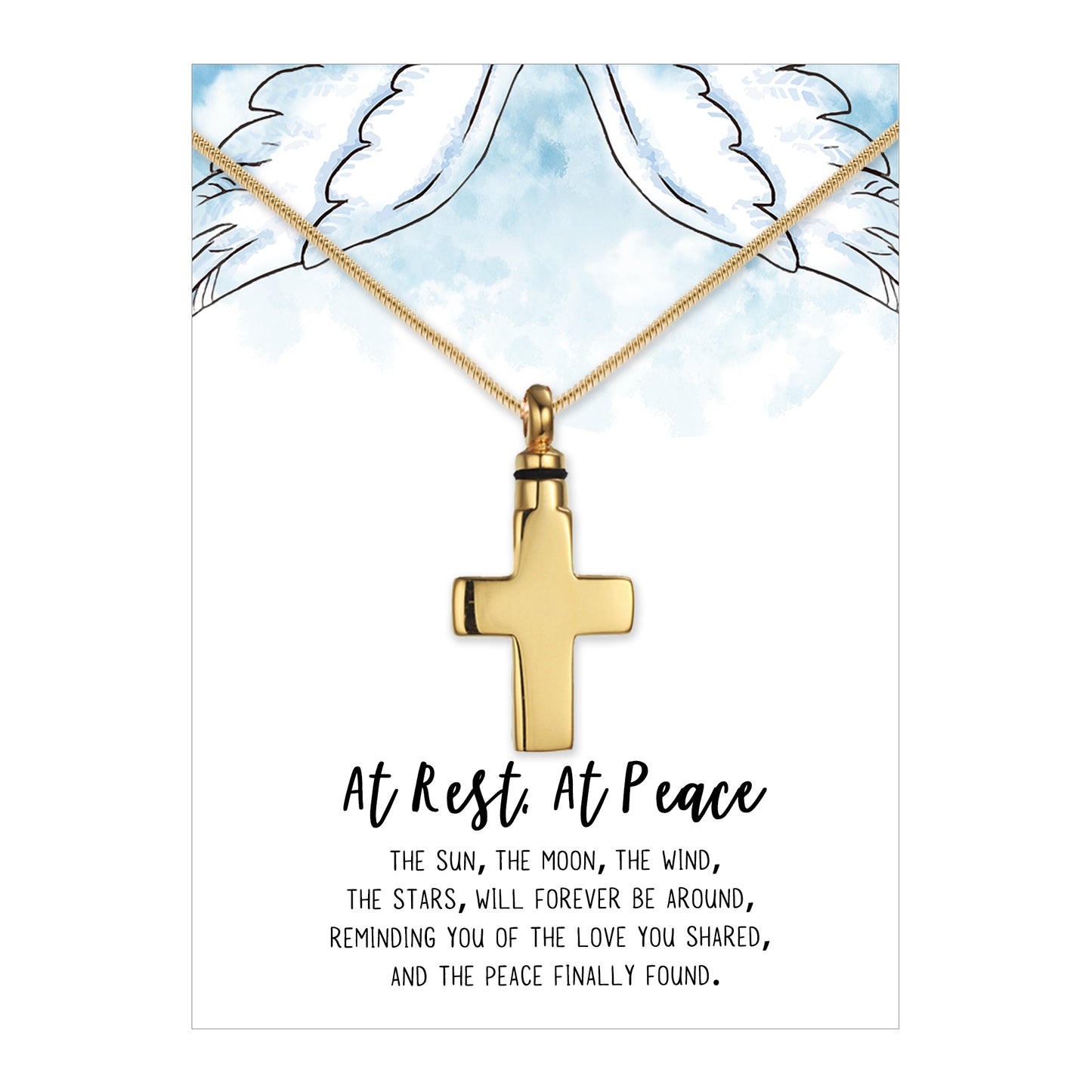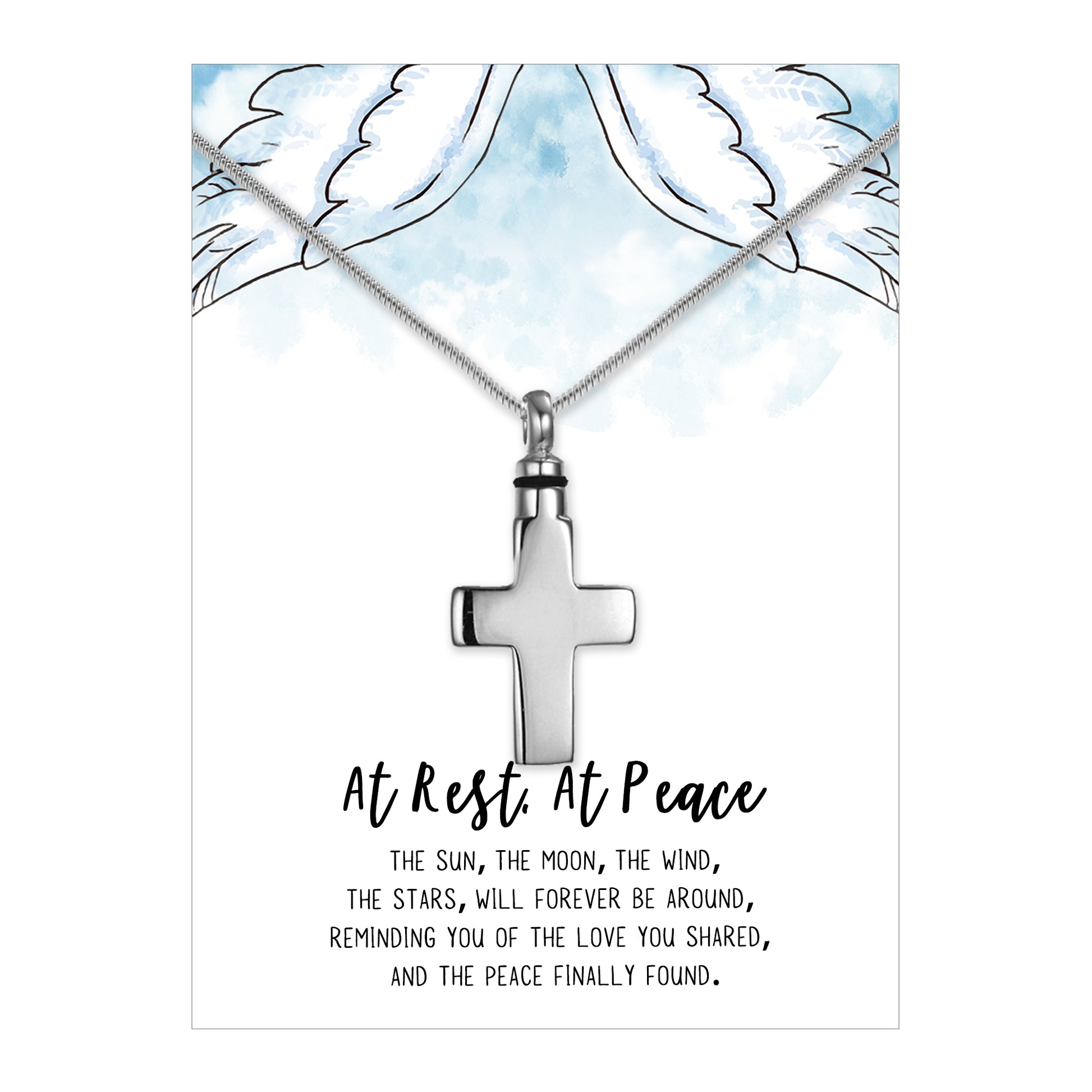 Attached to a backing card that reads "At Rest, At Peace," this necklace is available in silver, gold, and rose gold. It comes in an Anavia gift box, making it a meaningful keepsake or a comforting gift for remembering someone special.