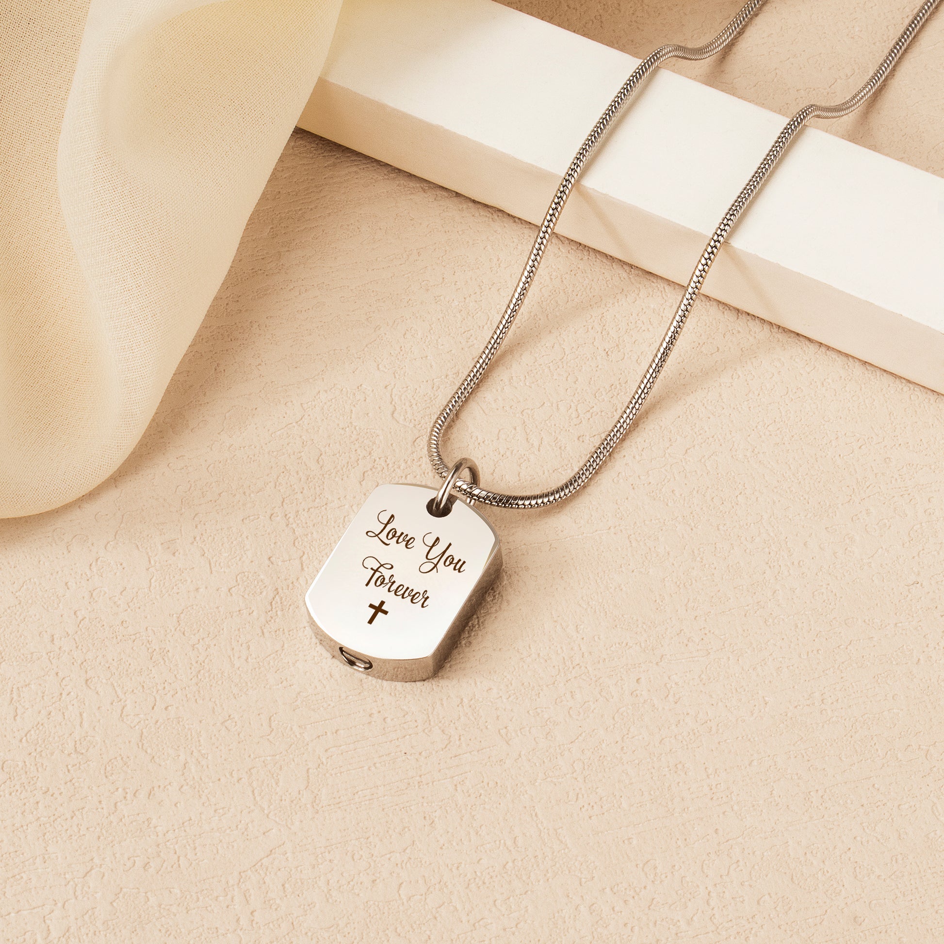 Keep your loved one close to your heart with this stainless steel memorial dog tag urn necklace. Thoughtfully designed to hold a small amount of ashes, hair, fur, or other meaningful keepsakes, this necklace offers comfort and remembrance in a simple, timeless design.