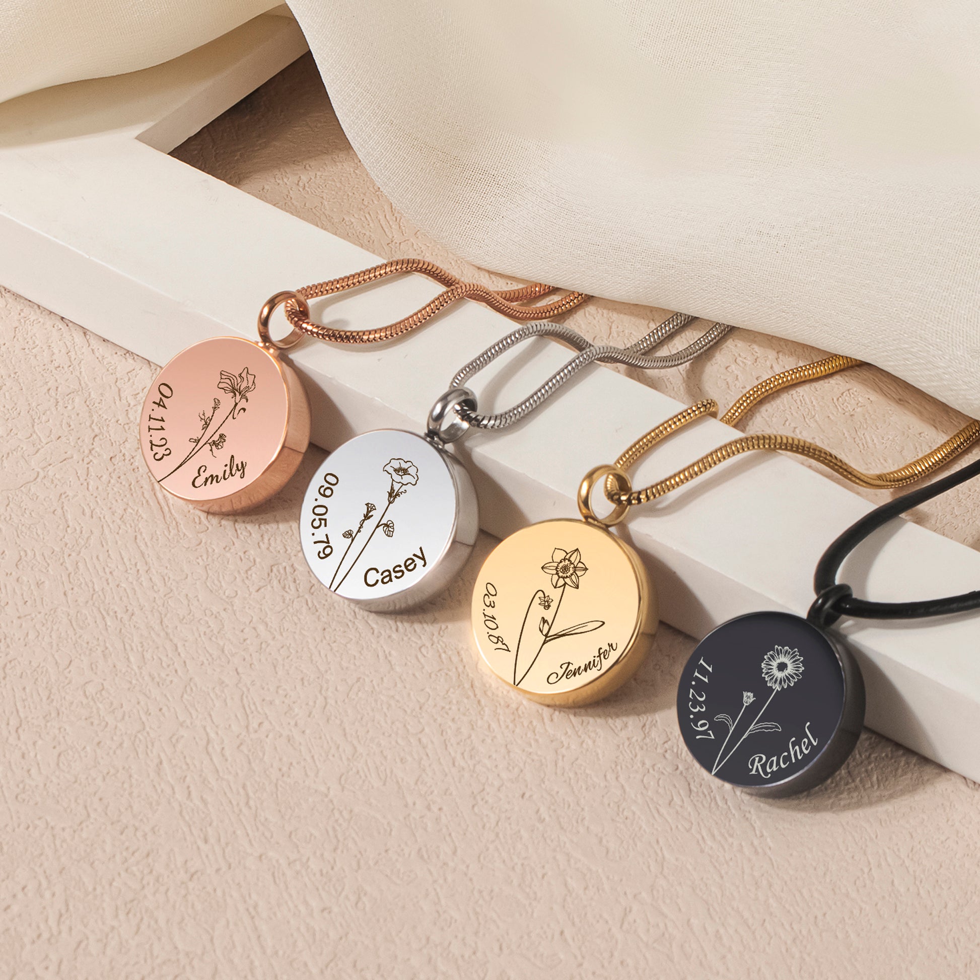 The front of the pendant can be custom engraved with a delicate flower design, their name, and a meaningful date, creating a heartfelt and personal tribute. Whether it’s a birth flower or simply one that symbolizes your love, this thoughtful detail makes each piece truly one of a kind.