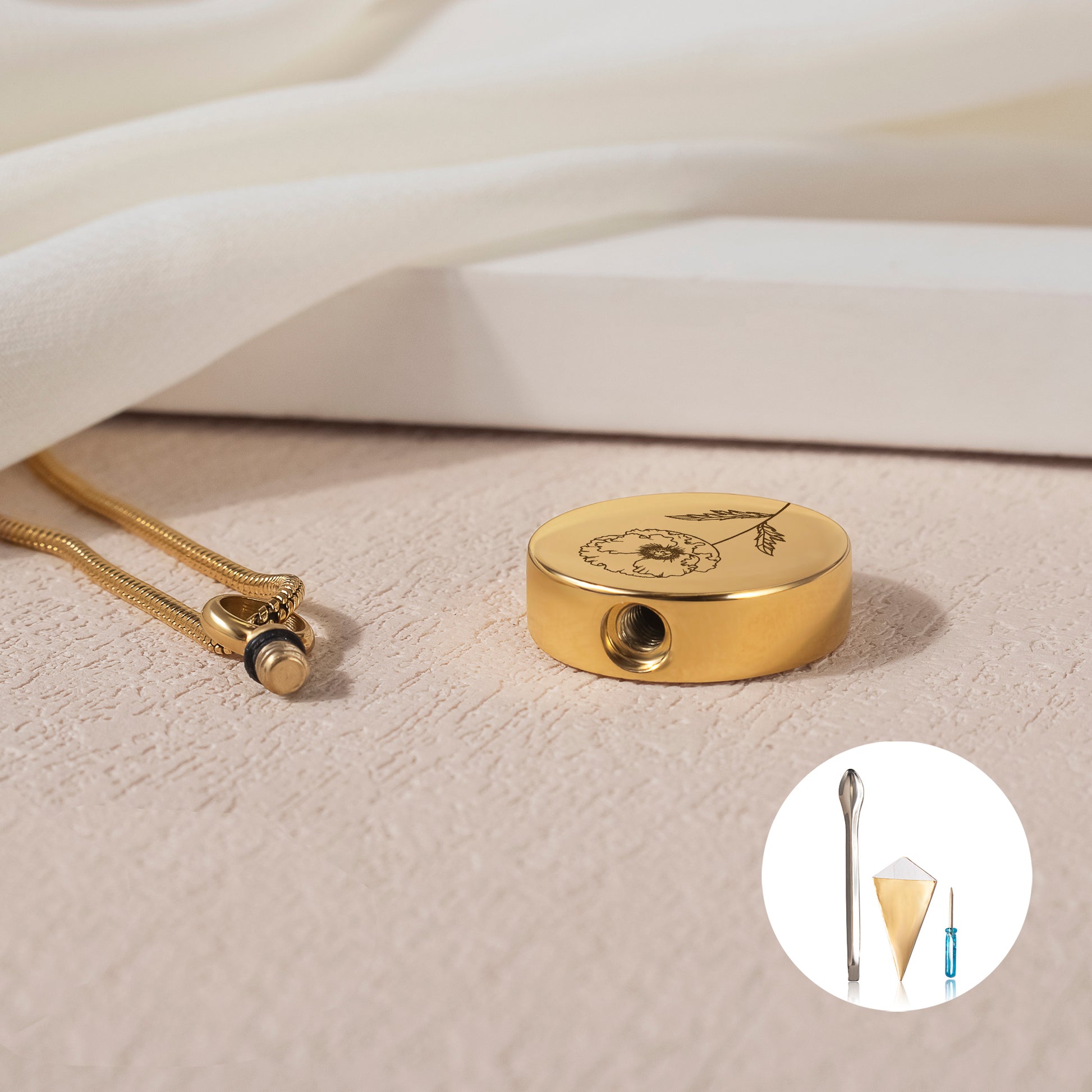 Hold your loved one close with our sleek and timeless Memorial Urn Necklace. Made from durable stainless steel and available in four elegant finishes; silver, Rose Gold, Gold, and Black. This necklace offers a discreet way to carry a small amount of ashes, fur, or other mementos close to your heart.