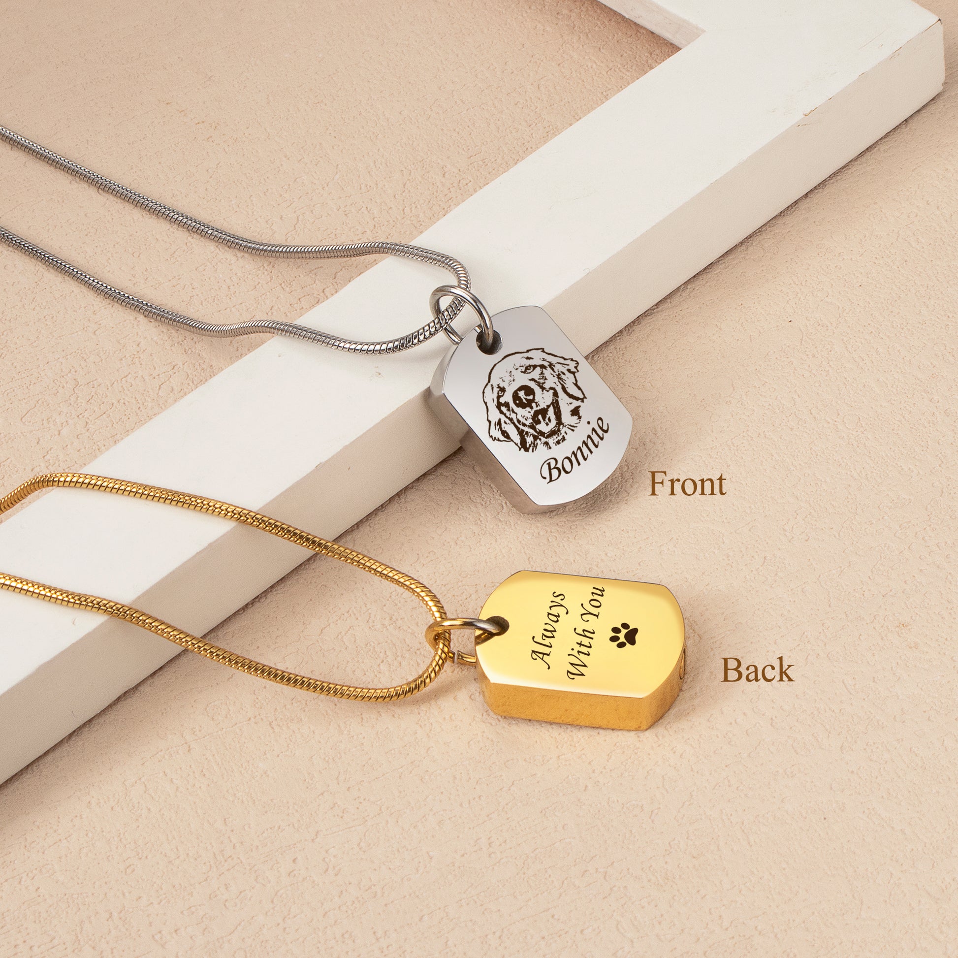 Made from durable stainless steel, the dog tag pendant is available in silver, gold, and rose gold for everyday wear. The front can be personalized with a custom pet portrait, creating a one-of-a-kind tribute that captures your pet’s unique spirit. Inside, a secure compartment safely holds your memorial keepsake, offering comfort and connection during times of remembrance.