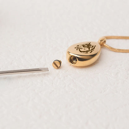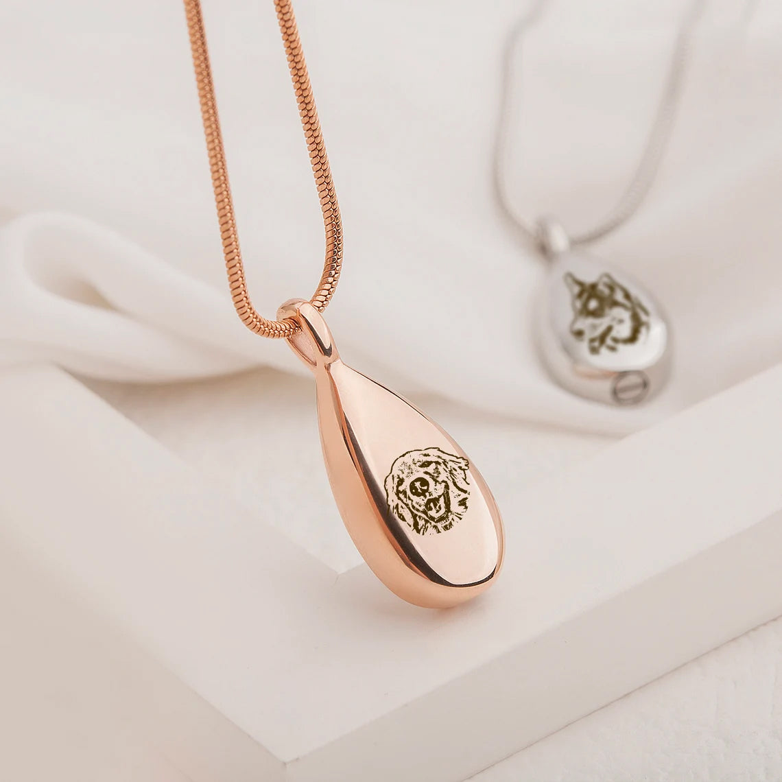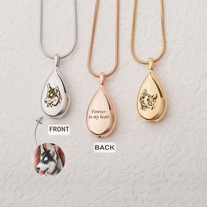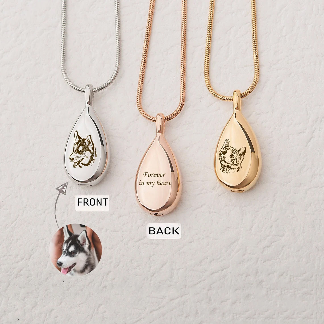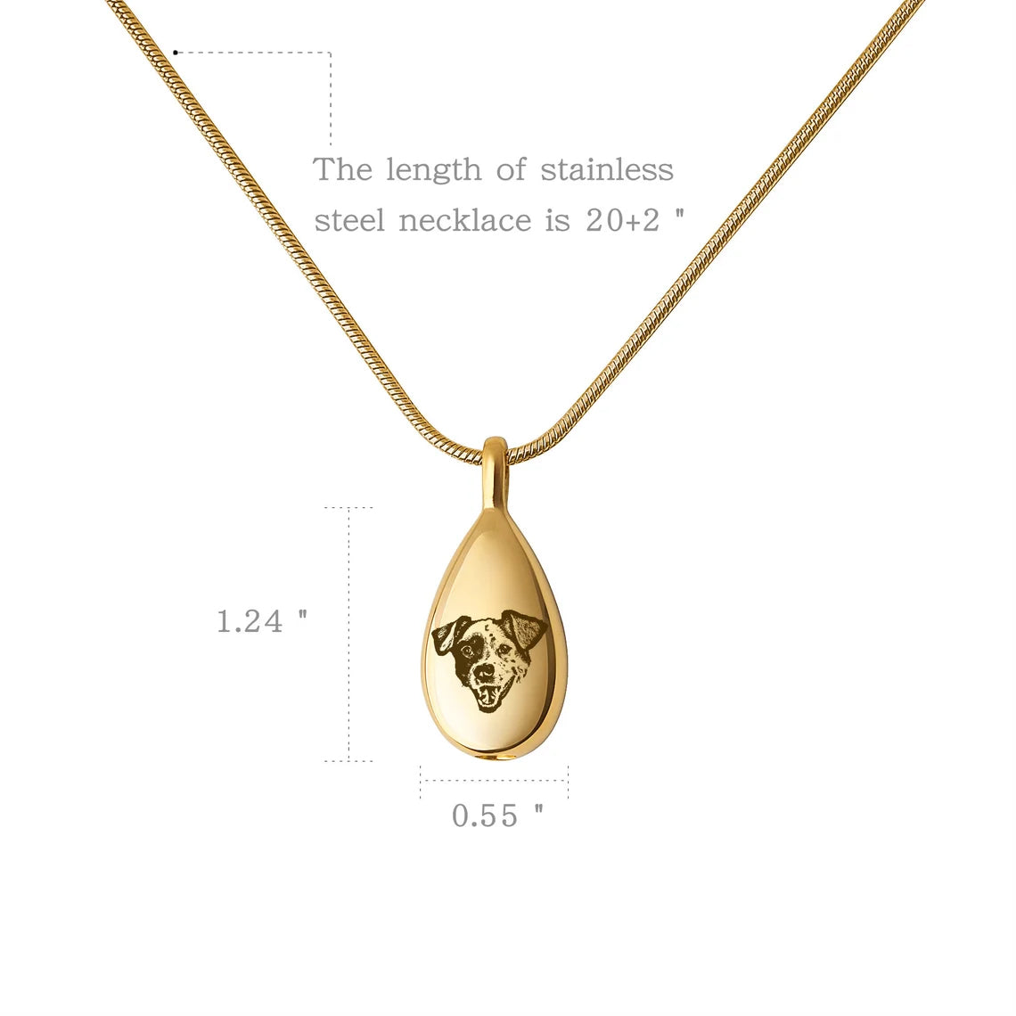 Keep your cherished memories close with our Teardrop Memorial Ashes Holder Necklace, now available with a custom-engraved pet portrait on the front. Elegantly crafted from high-quality stainless steel, this teardrop-shaped pendant symbolizes both sorrow and the everlasting love you carry for your beloved pet.